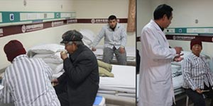 左图:田大爷及妻子和儿子在医院的病房 右图:主任到病房探望田老奶奶及其儿子