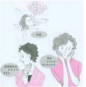2:植物神经功能絮乱:头晕目眩,口干,喉部有烧灼感,面色潮红,头痛,思想不易集中,而且紧张激动,情绪复杂多变,性情急躁,失眠键忘,容易焦虑,心情抑郁,皮肤发麻发痒,有时有蚁走感。
